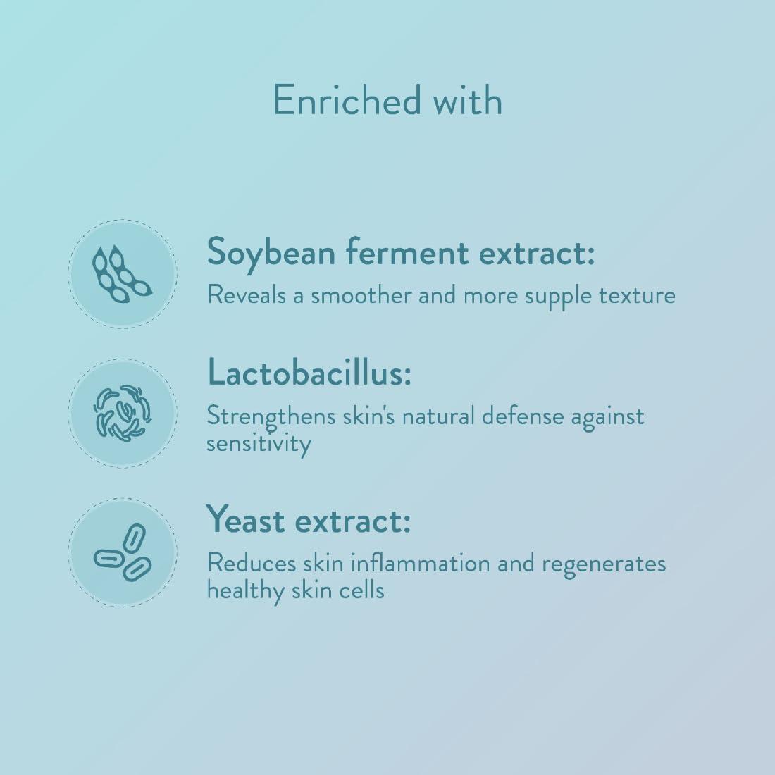 - Lactobacillus/Soybean Fermentation Extract + Yeast Extract: Repairs and calms stressed skin.